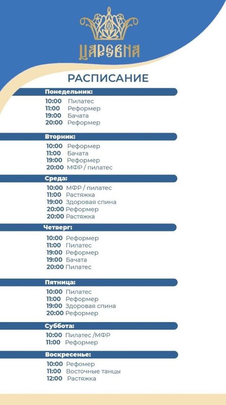 Насчёт времени вы можете подробно узнать у администраторов студии пилатеса Царевна. И не забудьте обсудить с ними или вашим тренером основные вопросы разрешённой степени нагрузки. Мы создаём все условия для вашего здоровья и хорошего самочувствия!